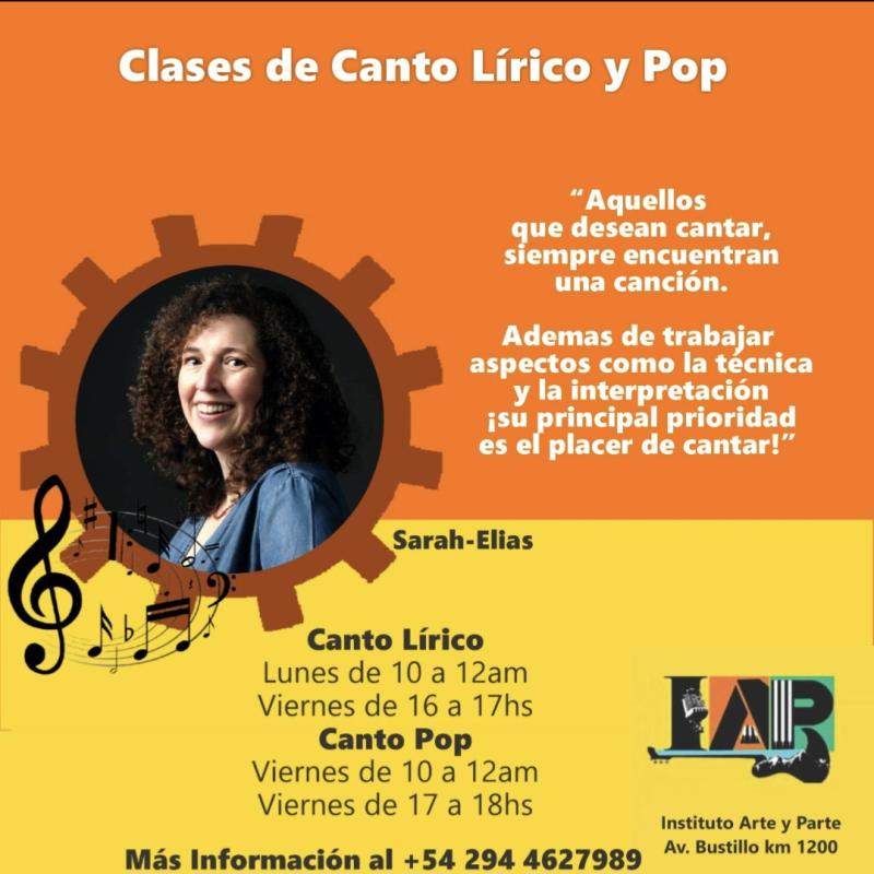 Sarah Elias es profesora de canto certificada. Da clases de canto para todas las edades, niveles y en todos los estilos. Ademas de trabajar aspectos como la tecnica de respiracion, la postura. la diccion y la interpretacion, ¡su principal prioridad es el placer de cantar! Las lecciones se dan en la practica docente en un lugar calida y confortable en el Bario Playa Bonita, San Carlos de Bariloche.